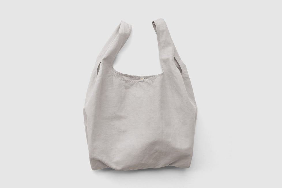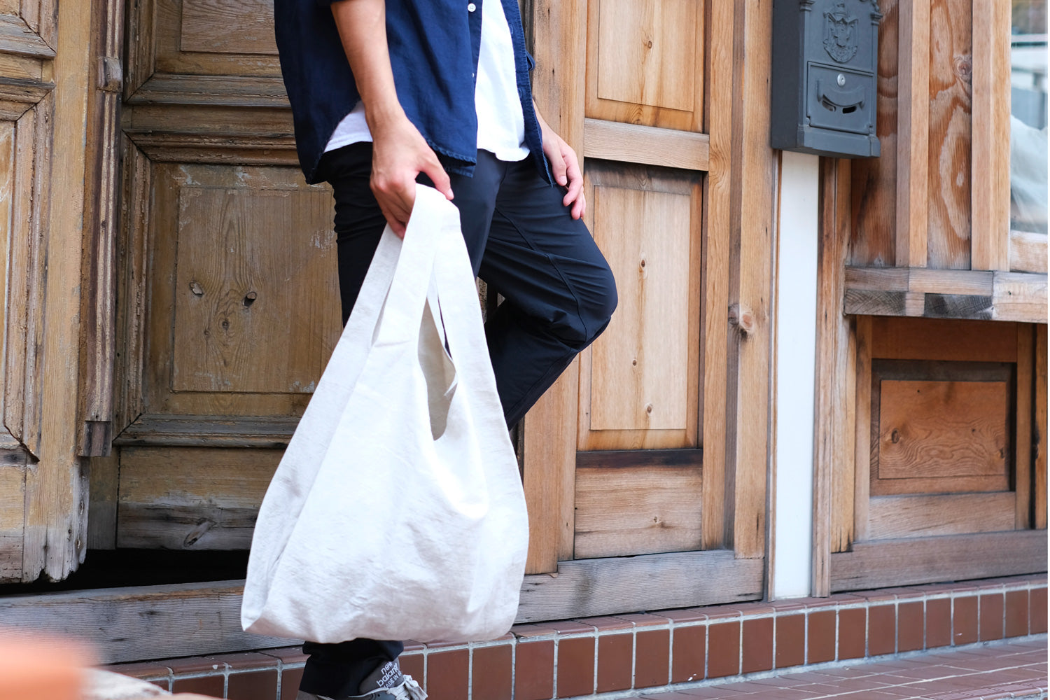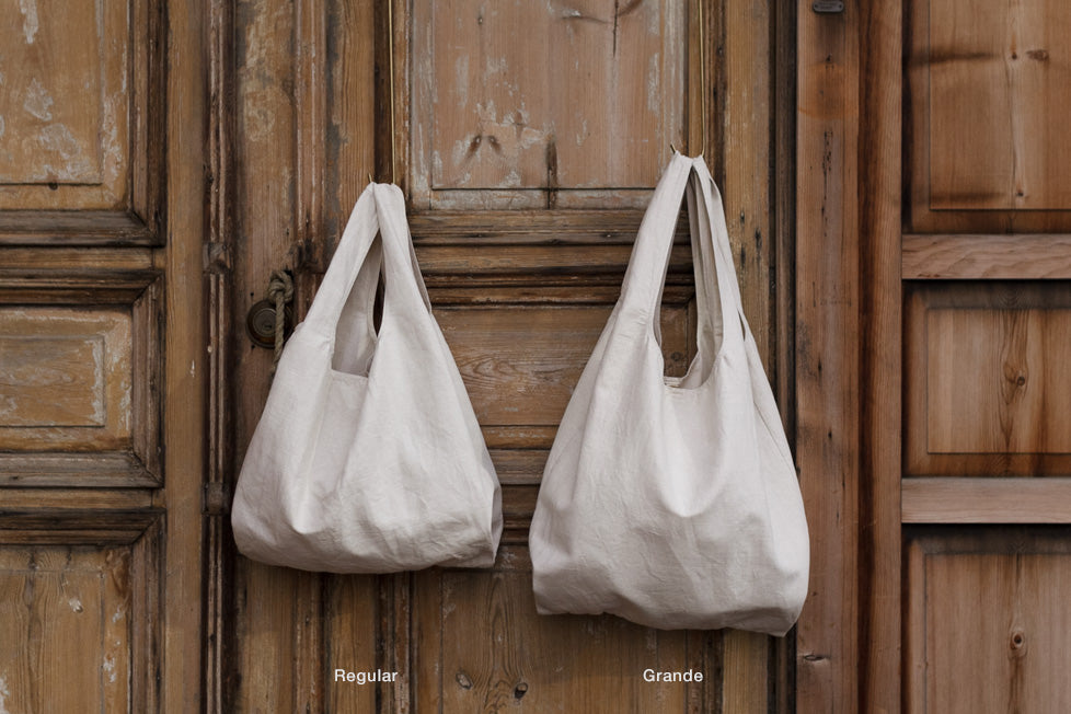 Grocery bag "YESSIREE". Uses high-density twill, which is made by weaving cotton warp and hemp weft closely with a shuttle loom. The tightly woven, sturdy material can withstand heavy weights and repeated washings. The side where the linen of the weft can be seen is the front, and the soft cotton of the warp is on the inside. The handle is set longer, so it can be carried by hand or over the shoulder. A strap with a snap button is attached to the mouth. In addition to being able to fasten the mouth of the bag, it can be turned around when the main body is folded into a small size to fasten the entire bag. Available in two sizes, Grande (large) and Regular (small). A logo is stamped on the inside of the main body.