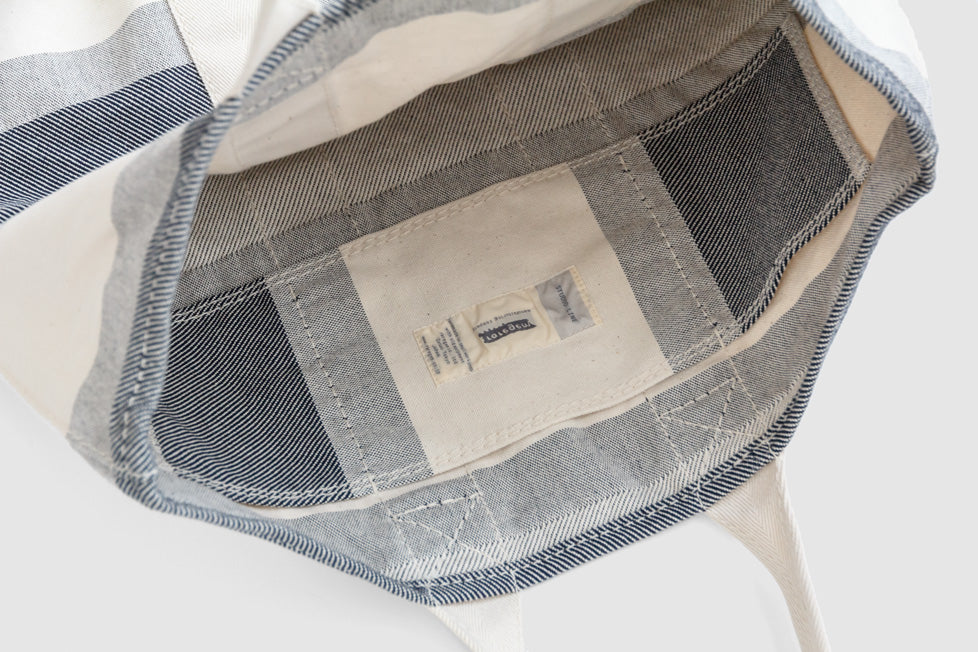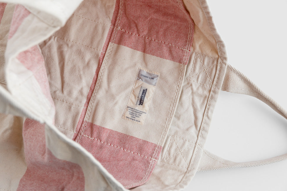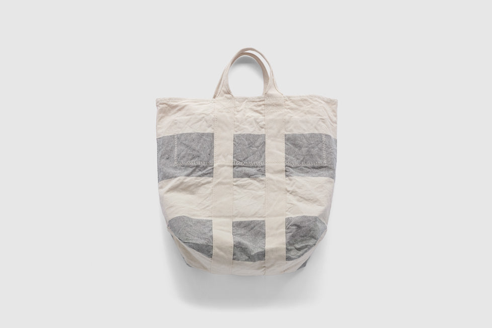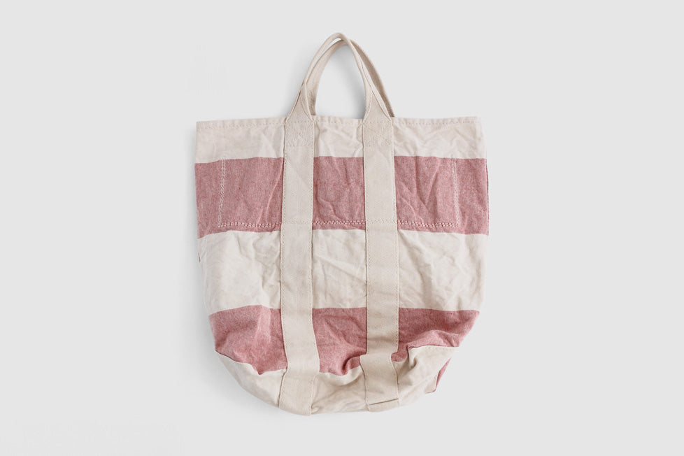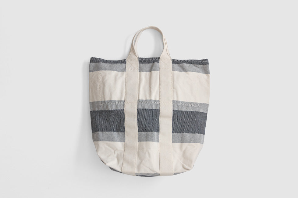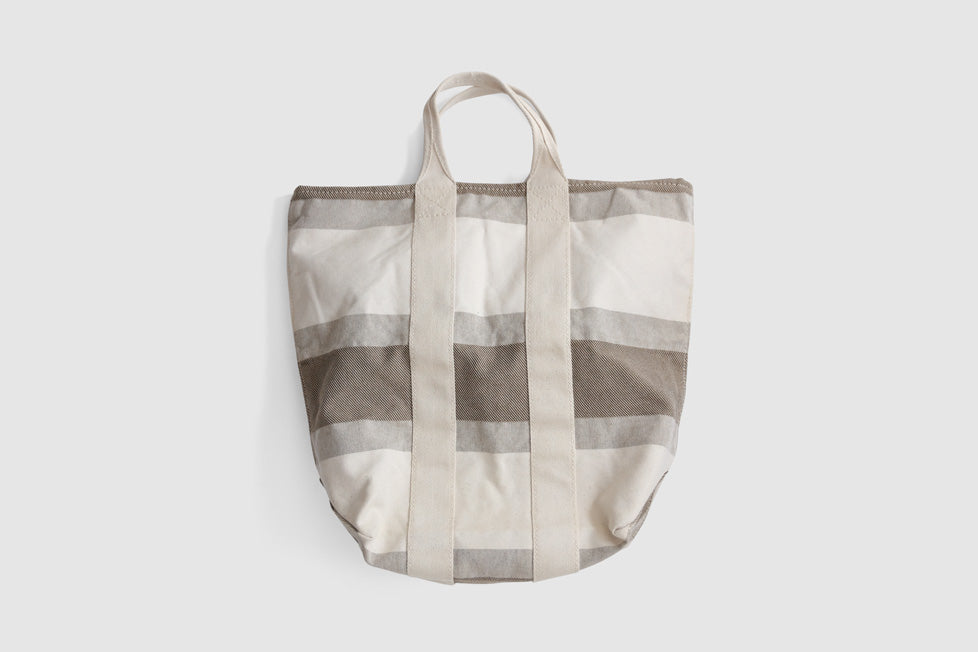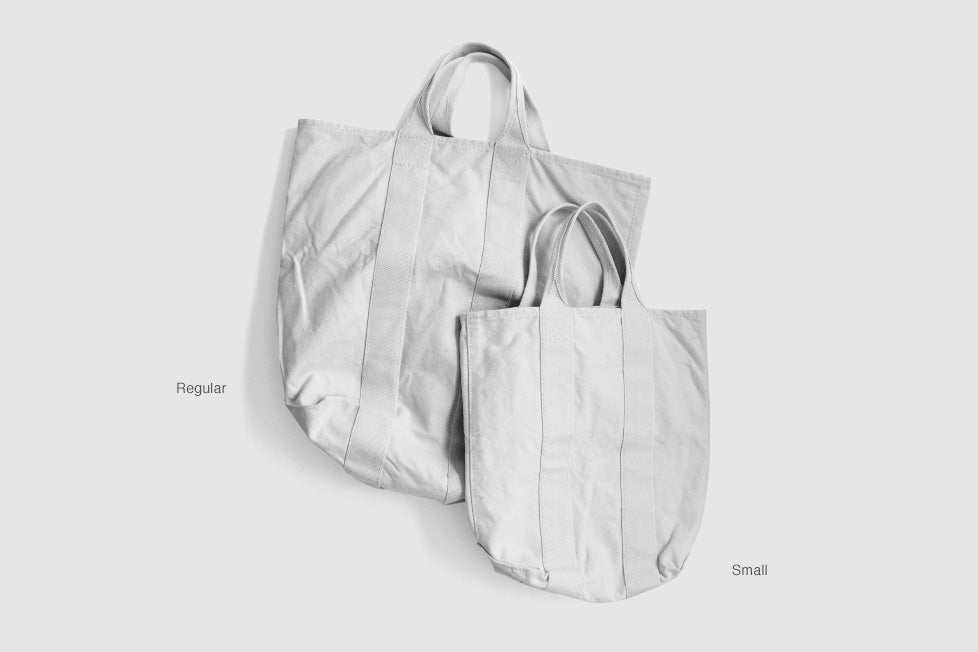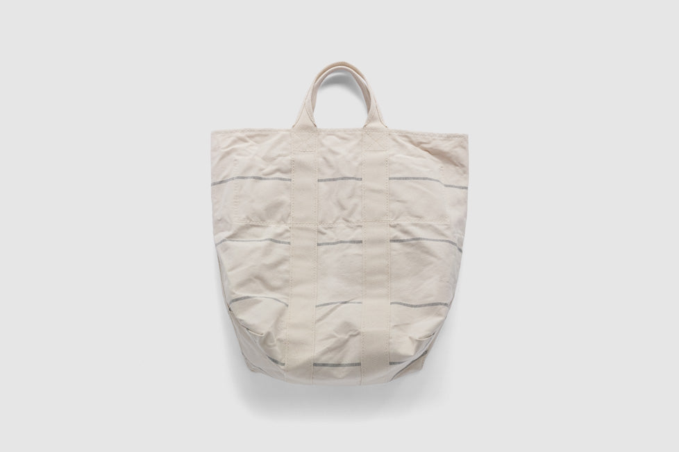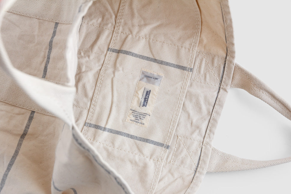 製品洗加工によって生じたアタリや撚れ、ふっくらしたフォルムなど全体的にラフな印象のバッグ。くるくると丸めてサブバッグとしても使用可能。ハンドルはコットンヘリンボーンテープ製。彩色付きの緯糸を平織・綾織で織り込み、一枚の生地の中で色の出方や生地の質感に変化をつけた特注8号帆布を使用。
