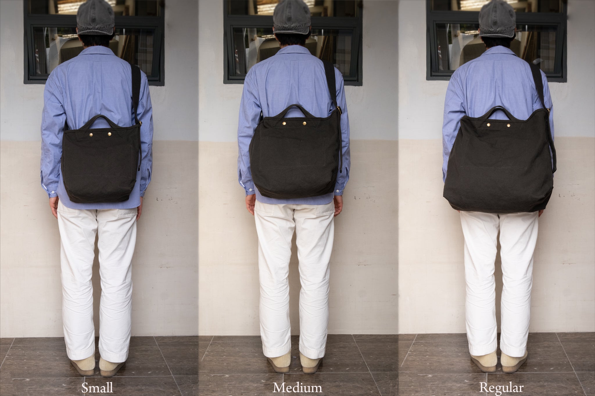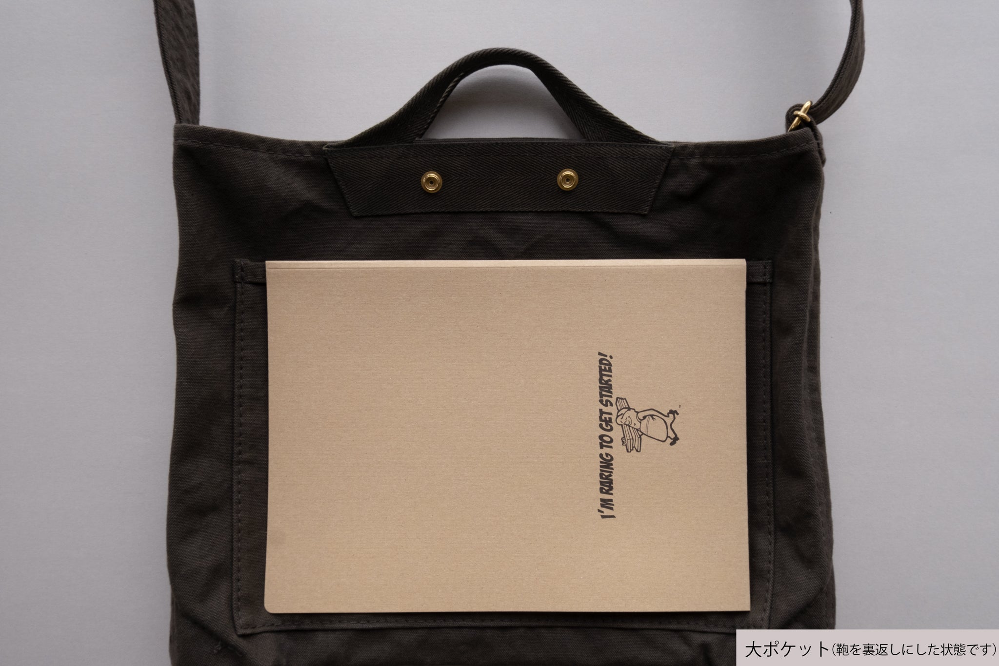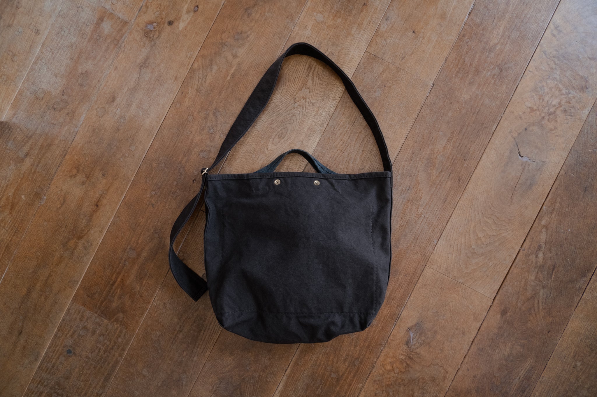 チャコール色の硫化染めを施した8号帆布をワンウオッシュ加工で仕上げました。深みのある色合いに独特の張り感や風合いがあり、使い込むほどに雰囲気良く育つ素材です。ショルダーストラップは広幅で肩掛けしやすく、長さの調節も可能です。オリジナルの厚手ヘリンボン織テープで組み立てたショートハンドルは、掴みやすく安定感があります。すっきりとした広い庫内に、機能的な内ポケットがつきます。スナップは真鍮製のオリジナルボタン、あらかじめヴィンテージのように使い込んだ加工をしており、経年によりさらに雰囲気が増します。丸洗いは可能ですが、多少の色落ちや縮みがみられることがありますのでご注意ください。