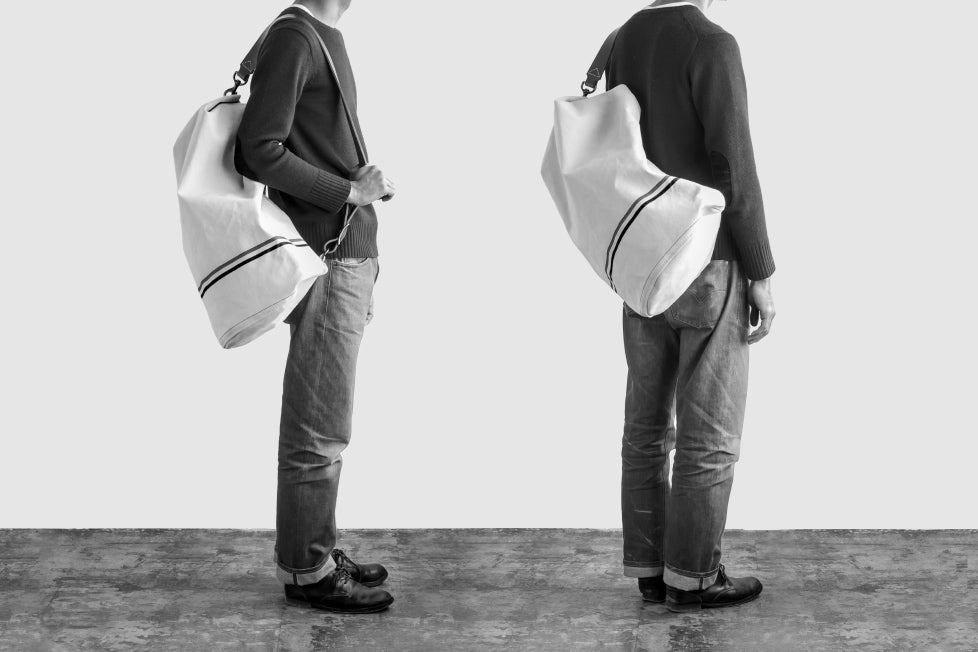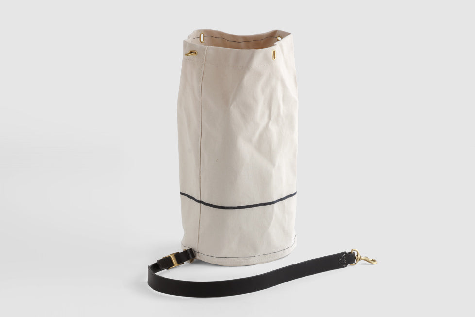 開口部のU字型金具にハト目を通してロックするダッフルバッグ。特注4号帆布のボディに厚手のタンニン革製ショルダーストラップを組み合わせたタフな仕様。